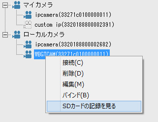 Windowsアプリでメイン画面のローカルカメラにあるIPカメラのアイコンを右クリックすると、「SDカードの記録を見る」の項目が表示されます。