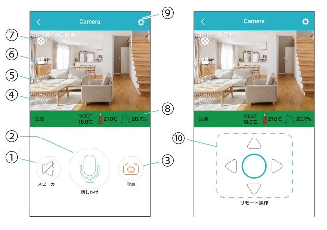 カメラ周辺の温度/湿度/WBGT(熱中症指数)が表示されます。(表示エリアはWBGTの危険度を注意/警戒/厳重警戒/危険の4段階に色分け表示)